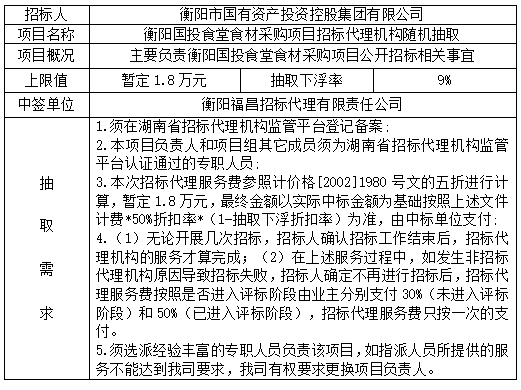 衡陽國投食堂食材采購項目招標代理機構隨機抽取結果公示
